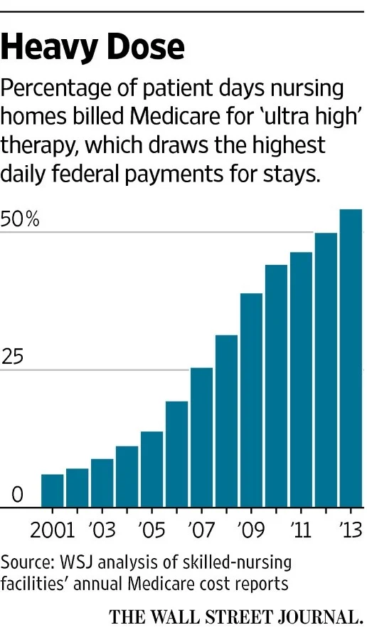 For some additional perspective, the following chart shows the explosive growth in the billing of “ultra high” SNF therapy, which draws the highest federal payment amounts.