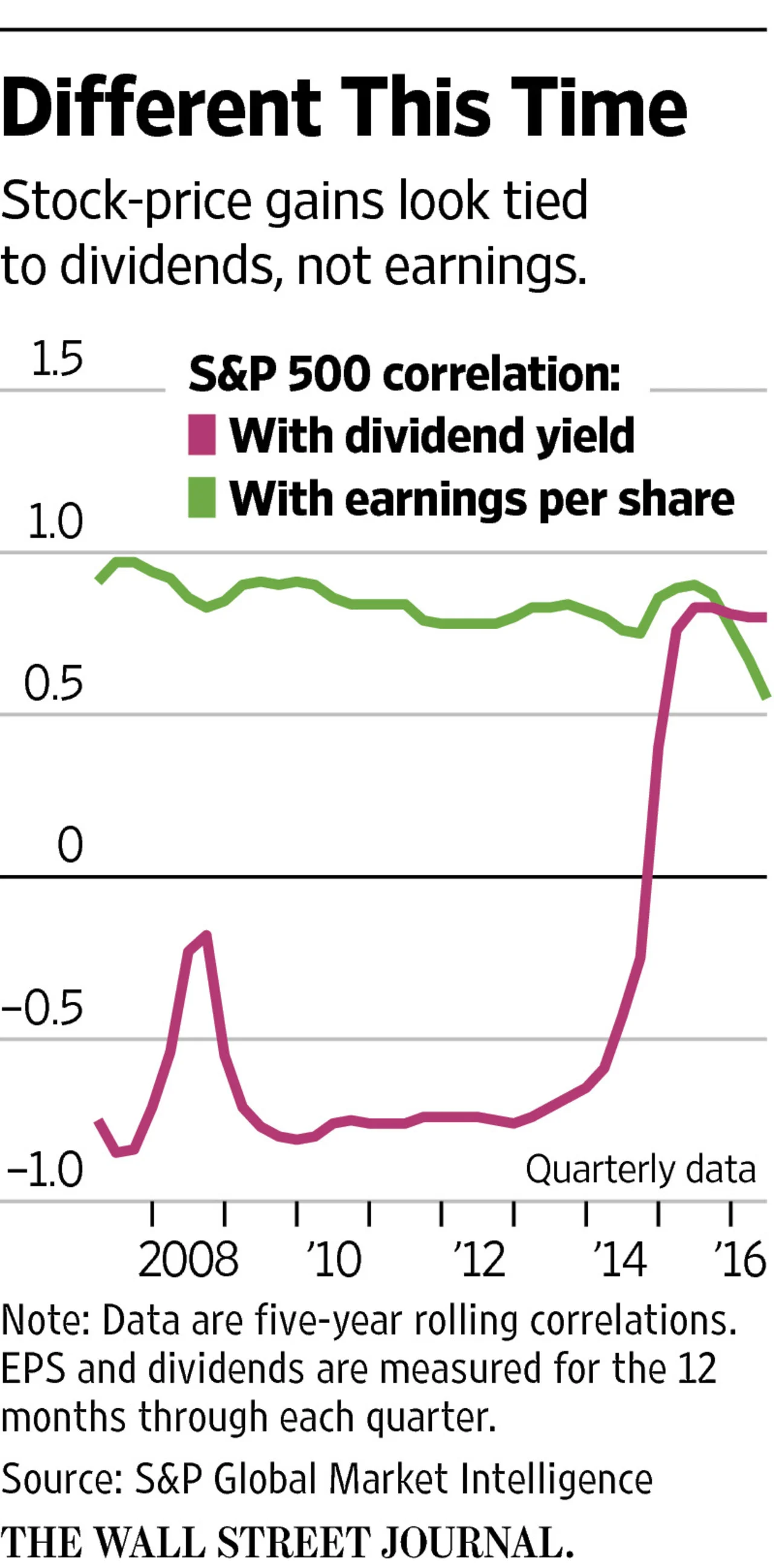 Income investors are frustrated with artificially low interest rates, but this chart really helps put that into perspective. Rather than being driven by earnings, S&P 500 stock returns are being driven by the size of their dividend yield. The bigger the yield, the better the return. At least that’s seems to be the case as shown by the five-year rolling correlation between S&P 500 companies’ dividend yield and the index’s performance.