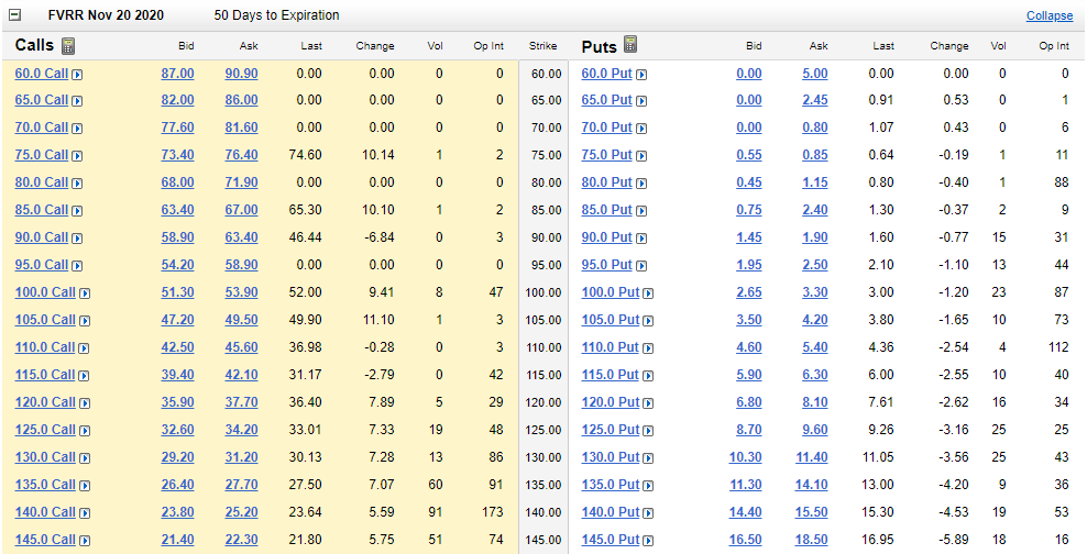 Fiverr (FVRR) is a global marketplace connecting freelancers and businesses for their digital service needs. The business was already growing rapidly, and now growth has been accelerated by the pandemic as high unemployment and alternative working needs have driven people to the platform. The share price has increased rapidly (see chart below), and some investors are nervous, especially considering heightened volatility expectations as we head into the US election season. Rather than purchasing shares outright, the extremely high upfront premium income available in the options market (for selling puts) is compelling because it gives us a chance to own the shares at a significantly lower price, and we get to keep that extremely high upfront income, no matter what.