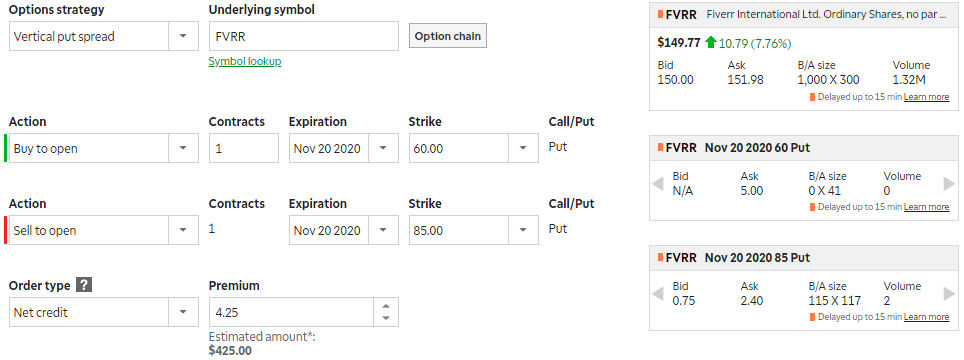 The two big volatility risks on this trade are (1) the volatility risk of the upcoming presidential election in the US on November 3rd (a lot of people are fearful), and (2) the volatility risk of the company’s earnings announcement (expected around November 13th). Both of these events occur before this contract expires, and thereby add significant uncertainty to the share price, but it is that uncertainty that makes the upfront premium income so attractive, and at a price of $110 per share, we’d be happy to have a position in Fiverr. And whether or not the shares get put to you, you still get to keep the attractive upfront premium income generated by the trade.