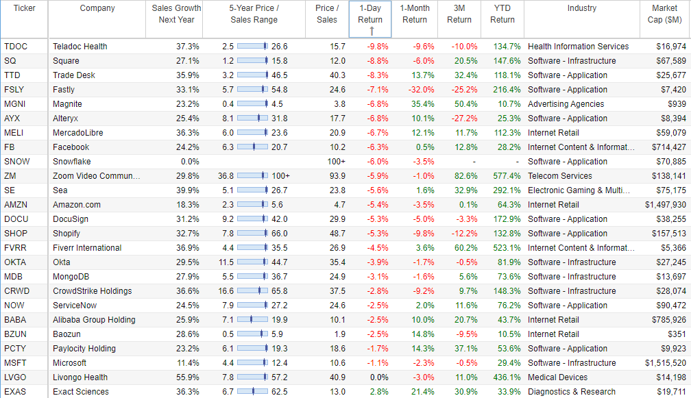 One theme to keep in mind as you review this list is sales growth versus valuation. In particular, all of the names on the list have very high expected future sales growth rates (and the leadership and big market opportunities to back them up) combined with attractive valuations (as compared to their long-term growth potential). For perspective, here are some growth and valuation (price-to-sales) metrics on a handful of top growth stocks.