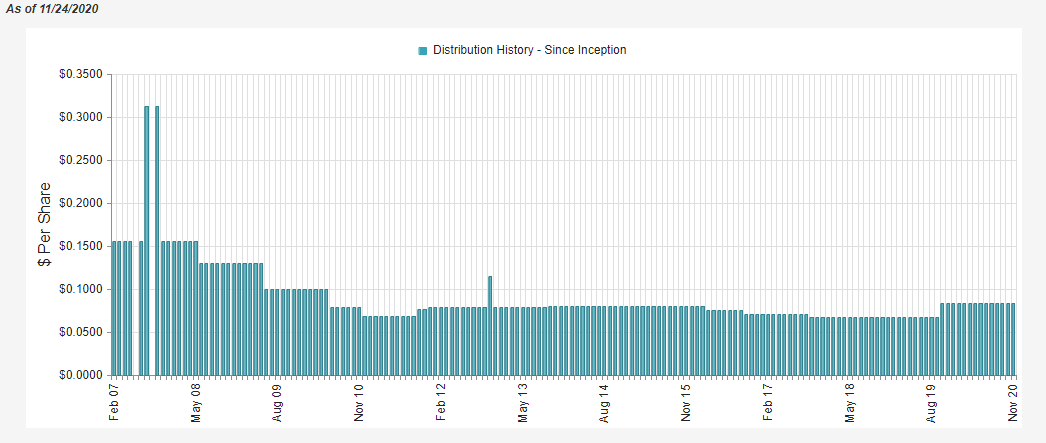 If it is steady income payments you seek, you might be happy to know both of these CEFs pay income to investors monthly. And as you can see in the following charts, this income has been steady in recent years (even slightly rising):