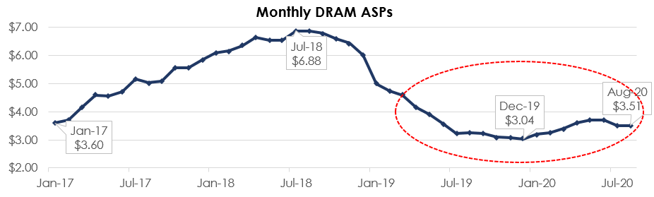DRAM Supply Cycle: Over the past several months, the DRAM market has been grappling with certain oversupply issues caused by too much capex spending by the manufacturers to increase capacity in order to be in a better position to compete. The server DRAM segment in particular has been the worst effected, as server manufacturers have been unable to offload their excess inventory on account of lower server demand in a growing cloud environment. This has led to persistent downward pressure on the overall average selling prices (ASPs) of DRAM since it peaked in July 2018.