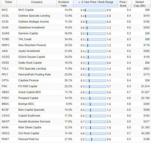 As we survey the BDC market, it is important for investors to not be fooled by price to book values. Specifically, price to book value is one common valuation metric used in the BDC space, and as you can see below, many of them (that were trading near 5-year highs just a few short weeks ago) are now dramatically less expensive.