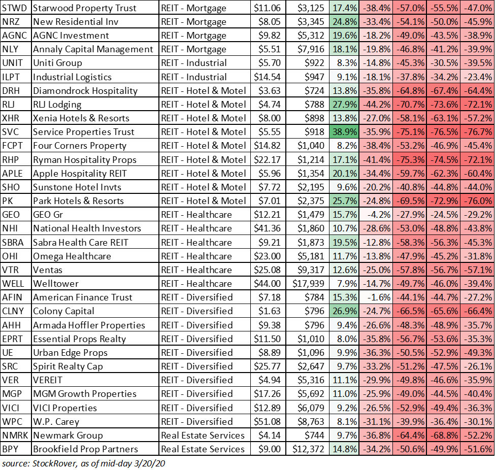 With the Fed’s emergency rate cuts you might think REITs would be doing well in this environment (because their businesses rely heavily on borrowing, and the cost of borrowing was just lowered for some REITs), but as you can see in the following table that has NOT been the case for high-yield REITs.