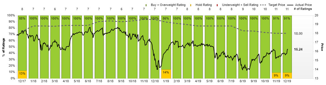 For some perspective (and please take it with a grain of salt—because these are “sheepish” Wall Street analysts), 10 out of 11 analysts reporting to FactSet (as shown in the following chart) currently rate the shares a “Buy,” and the average price target is $18—suggesting the shares have more than 10% upside from here, and that’s in addition to the company’s big healthy 12.3% dividend yield.