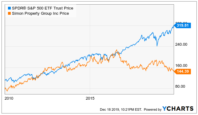 The negative narrative that has been putting selling pressure on Simon says that the internet is going to put all shopping malls and retail stores out of business, and that’s why Simon continues to sell-off. However, this has created an attractive buying opportunity because the narrative is false in Simon’s case. Specifically, some less desirable “B-class” shopping malls are facing real challenges as shoppers change their habits. However, Simon owns attractively located, experiential “A-class” malls, and the business continues to set new positive financial records, quarter after quarter. On a price-to-FFO basis, Simpn has simply gotten too attractively-priced to ignore, especially considering the dividend yield has now climbed to an impressive 5.7%. We’ve written about Simon multiple times in the last year, often about the attractiveness of generating additional income by selling income-generating put options (a strategy that has continued to work well). However, the price, valuation and dividend yield of SPG is getting to attractive to not consider, in our view. We are long shares of SPG in our Blue Harbinger Income Equity portfolio, and you can read an example of one of our previous SPG reports here: