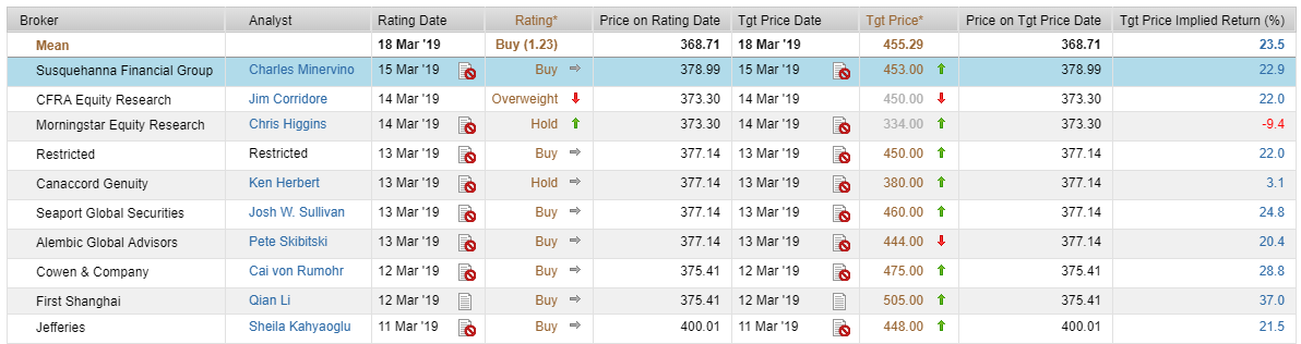 If you don't know, Boeing makes commercial airplanes (~70% of sales) and military defense equipment (~30% of sales), and they have an enormous backlog of future business (~5,900 planes) which provides long-term visibility into future success. Demand for planes (and leasing of planes) makes Boeing a juggernaut of a business. For a little more perspective, Wall Street analysts still recommend buying even after the latest news (the second crash was reported March 10th), as you can see in the following chart.