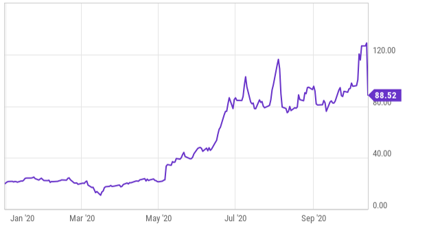 Fastly’s share price has performed extremely well this year, particularly following the onset of the global pandemic, as shown in the following chart.