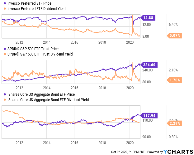 Before getting into the top 7, it’s worth noting that preferred stocks are often considered to be a hybrid security with characteristics of both common stocks and bonds. For example, preferreds often offer big steady income payments (like bonds), but they can also have share price volatility that (at times) tracks more like a muted common stock than a bond. For perspective, check out the historical prices and yields of preferred stocks, common stocks and bonds in the charts below.