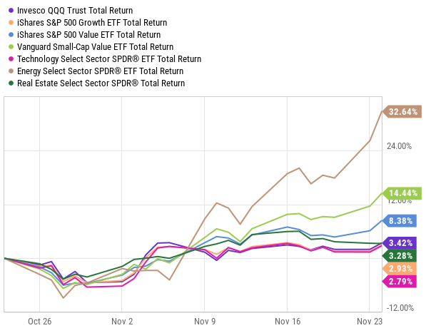 However, over the last month the story has almost exactly reversed as positive news on the vaccine front has led to stronger performance by beaten down market segments such as small caps, energy and real estate (i.e. the sectors that can pay higher dividends, especially energy and real estate, but also select small caps).