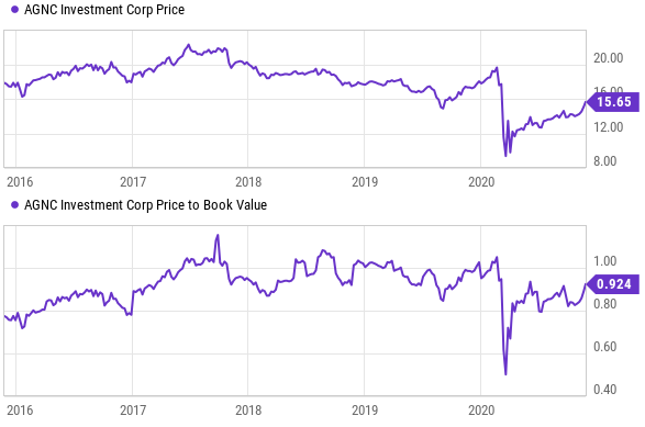 AGNC is a well run mortgage REIT that owns almost entirely agency mortgage backed securities, which are essentially backed by the US government. The share price got whacked earlier this year (as the broader fixed income market hit a bit of a liquidity crisis), but has recovered as the fed helped free up liquidity.