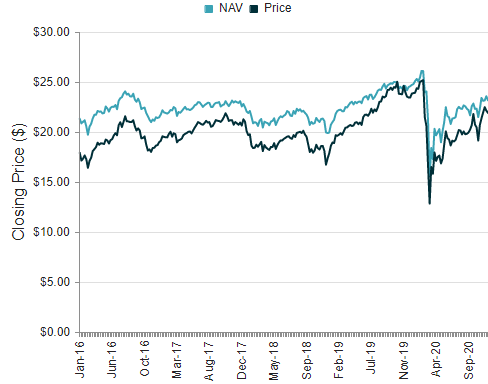 If you are an income-focused contrarian investor, you may be looking for opportunities among real estate securities, considering this has been one of the worst performing sectors of 2020 and it is know for its attractive dividend yields (and especially considering the potentially positive impacts of the recent coronavirus vaccines). In this report, we review an attractively priced real estate Closed-End Fund (“CEF”) that is able to offer investors a compelling 6.8% yield (paid monthly—MOPAY) thanks to its share price discount versus its net asset value (NAV) and its prudent use of leverage (~23.98%), among other important characteristics.
