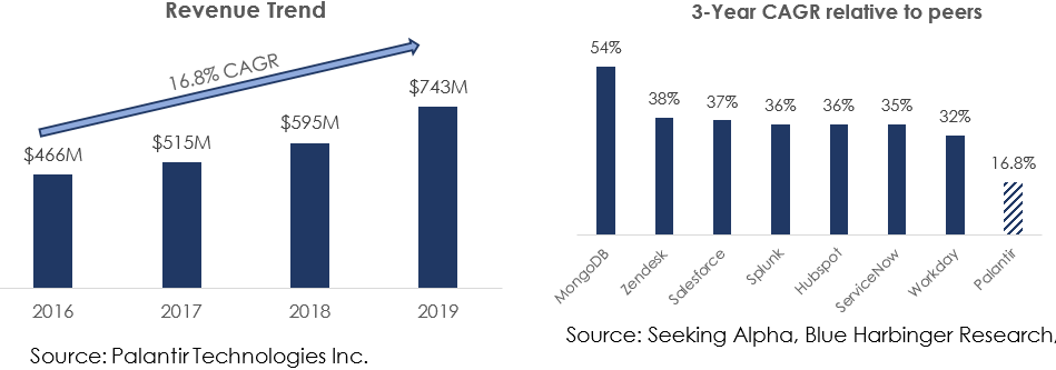 As evident in the chart below, Palantir’s revenue grew at a CAGR of just 16.8% between 2016-2019. Furthermore, Palantir’s historical growth has been subpar relative to other high growth software companies. This low relative growth historically despite significantly large and expanding addressable market is concerning.