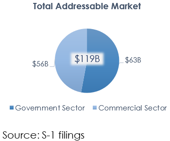 As per the company’s S-1 filings, Palantir has a large and expanding total addressable market (“TAM”) valued at $119B, implying Palantir’s market penetration is currently at less than 1%. The TAM includes an estimated commercial sector TAM of $56B and government sector TAM of $63B (U.S. government sector TAM: $26B). Since the company’s software is expensive and targeted at large enterprises, the Commercial sector TAM is based on 6,000 companies that have annual revenue of more than $500M.