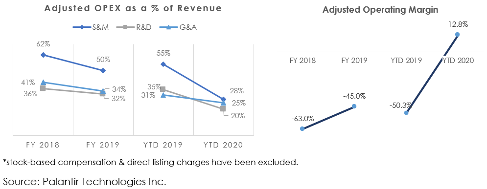 Despite being in business since 2003, Palantir has been unable to achieve profitability until recently. In 2019, the company’s adjusted operating margin was -45%, primarily as a result of high levels of investment in the business and lengthy sales cycles. This year, it has seen a significant improvement in operating margins as evident in the chart below. However, we believe the key reasons for this recent margin improvement have been: a) majority of the growth coming from existing customers requiring less incremental investment b) lower operating expenditures due to COVID-19 restrictions. Both these aspects are short lived as the company will have to ramp up spending again for landing new customers and spending on associated business expenses. We believe operating margins may be lumpy over the next few years and cannot make a confident case for significant operating leverage at this time.