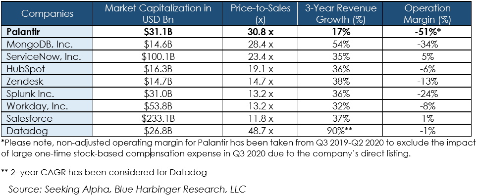 Palantir’s stock price has risen by more than 80% within 2 months of its listing. Strong price action has led to the company’s price-to-sales ratio expanding to nearly 30.8 times. The current valuation multiples are higher than most other high growth software peers despite a less than stellar track record in terms of revenue growth and operating leverage. We think the valuation currently leaves little room for error.