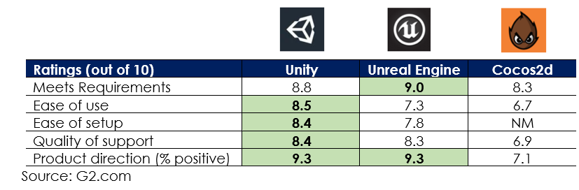Unity operates in a highly competitive industry where it competes with proprietary in-house game engines created by large game studios as well as 3rd party game development tools providers such as Unreal Engine by Epic Games and Cocos2d by Chukong Technologies. Having said that, through consistent research and development, Unity has secured a market leading position, becoming one of the most popular game engines in the world offering a wide range of tools and features that can be easily accessed even by less sophisticated game developers. Besides, its freemium business model helps attract and lock-in small creators who may later upgrade to premium offerings when their content becomes popular. We accessed independent user reviews from G2.com and found that Unity platform was one of the most popular product amongst its peers.