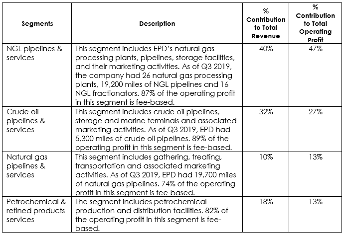 Incorporated in 1968, Enterprise Products was listed in 1998 under the ticker EPD. The company is the 3rd largest midstream service provider in the U.S. with around 50,000 miles of pipelines, 260 MMBbls of storage capacity for natural gas liquids, crude oil, petrochemicals, and refined products and 14 bcf of natural gas storage capacity. Revenue for EPD is classified as marketing activities and midstream services. Marketing activities include revenue for product sales whereas midstream services include fees from EPD’s integrated businesses such as gathering, processing, transportation, fractionation, storage, and terminaling. Operating profits for EPD are somewhat immunized to energy price fluctuations considering 85% of the operating profit is generated from fee-based sources.