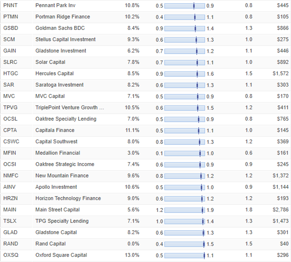 High dividend yield as BDCs are required to distribute 90% of their profits to shareholders as per the governing law.