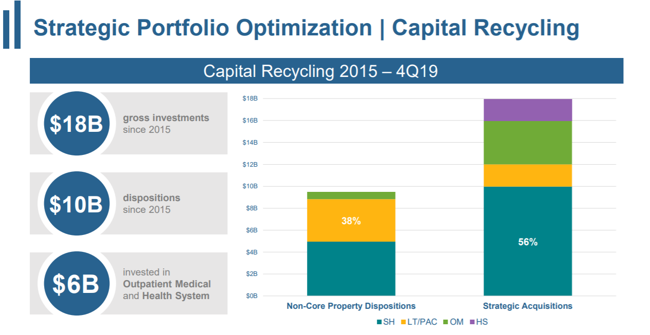 Over the last few years, Welltowere has recycled about $6 billion of its 2015 asset base into higher quality assets. For example, about 38% of the dispositions were in higher-cost Long term/Post Acute Care, while about 56% of strategic acquisitions were in lower-cost Seniors Housing. Management noted that it is focused on buying assets when they are out of favor at the right price in the right structure. In 2019, WELL acquired ~$4.8 billion of high-quality assets at a blended cap rate of ~5.8%. Management expects many of these newly built assets to stabilize in next 12 to 24 months and consequently that 5.8% will attractively grow to above 6%.