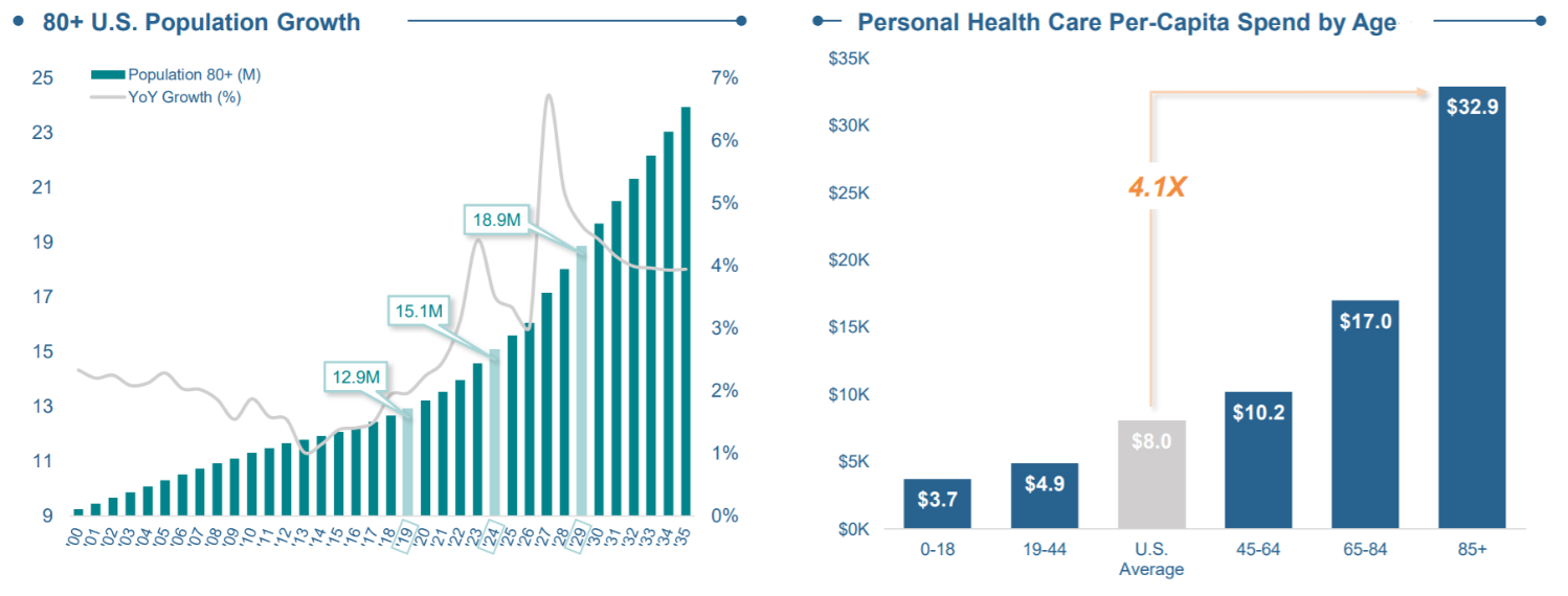 WELL is well positioned to benefit from aging population growth in the US. According to data from the National Investment Center for Seniors Housing and Care (NIC), The US ”80+ population” is projected to double in the next twenty years rising from 12.9 million in 2019 to 27 million in 2038. Also, the 80+ population is anticipated to grow 8x faster than total population over next 20 years, and it spends 4x versus every other age cohort combined on healthcare. Only 10.9% of the US 80+ population currently resides in senior housing which suggests significant under penetration. As such, demand is expected to grow with over 200,000 senior housing units needed over next 5 years, generated by growth in the aging population. This should drive occupancy levels for the existing players. According to NIC, an ~150 bps increase in industry penetration rate to 12.4% would produce 100% industry occupancy.