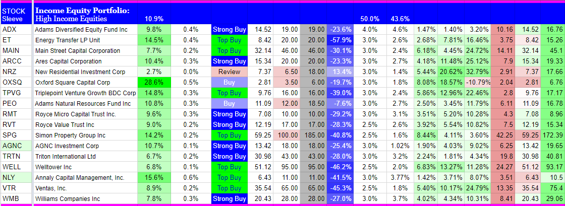 Worth mentioning, if you look on the Master Portfolio tab of the Tracking Tool, you'll see that almost all of our holdings are up significantly over the last month and especially the last week. This is especially true for the "High Income Equity" sleeve of our Income Equity Portfolio. High Income Equities were among the hardest hit by the pandemic, but as more states begin their phased re-openings, "high income equities" are just getting started in terms of a rebound. Of course there will be volatility, but we believe these stocks have considerable upside from here. You can see our specific recommendations for each position we own (i.e. Top Buy, Strong Buy, Buy, Hold and Review). These ratings also update in real time as the market moves based on the "Buy Under" prices we have set. From time to time, we update the "Buy Under" prices too based on our research, but we leave the original "Buy Under" prices in the spreadsheet for your reference.