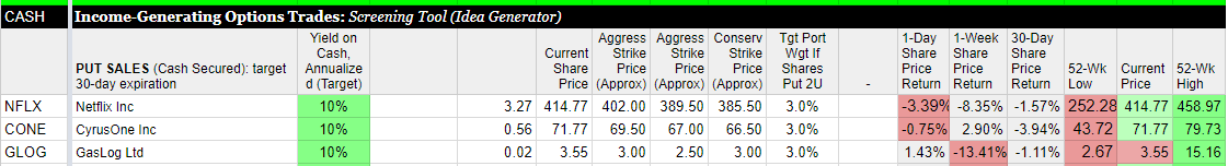 Specifically, based on market prices, and our views on the securities we like, the option trade section of the Master Portfolio tab automatically suggests a few potential options trade ideas (i.e. selling income-generating put options or selling covered call options). However these are just model-driven suggestions, and we always roll up our sleeves to review the latest fundamental and technicals before suggesting any income-generating options trades via a formal report. Also worth mentioning, we highlight a few "Income Via Growth" stocks at the bottom on the Master Portfolio Tab. Some investors like to generate some of their income through long-term growth stocks (i.e. selling some of their winners) and that is the reason behind the growth stock suggestions. Those ideas are generally updated once per month, within a few business days of month-end.