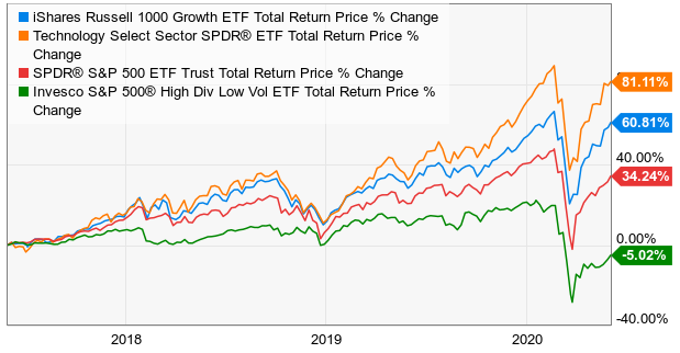 For starters, here is a look at the performance difference of Growth Stocks (Russell 1000 Growth), Technology (XLK) and High Dividend stocks (SPHD) in recent years.