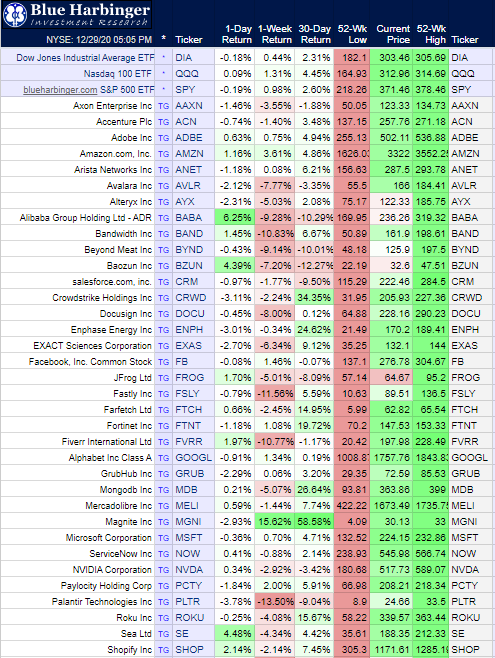 Obviously, the market was volatile in 2020 due to the global pandemic, but it has also been particularly volatile in recent trading sessions for many top growth stocks—those with the highest revenue growth that have been performing so extremely well in recent months. For starters, here is a performance chart for the overall market in 2020 (including the S&P 500 (SPY), the Nasdaq 100 (QQQ) and a Cloud Computing ETF (SKYY)—one of the hottest groups of stocks in 2020, which happens to have very high revenue growth numbers), followed by a table showing recent performance of a handful of recent top revenue-growth stocks.