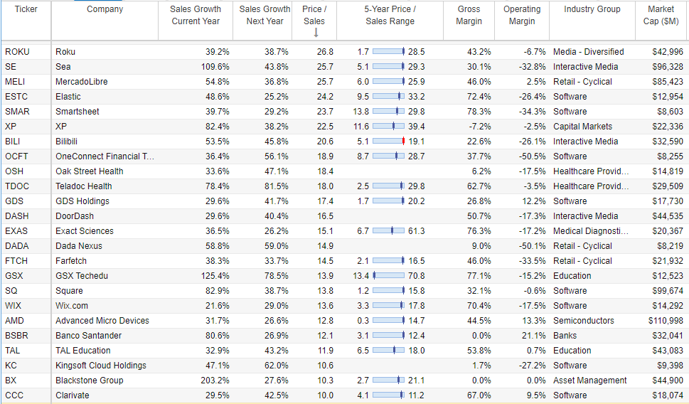 And if you are wondering if this latest price pullback (for top growth stocks, in particular) provides enough margin of safety for you to add shares to your portfolio, consider this price-to-sales valuation table (below). It shows the top sales growth stocks are still generally expensive on a price-to-sales basis.