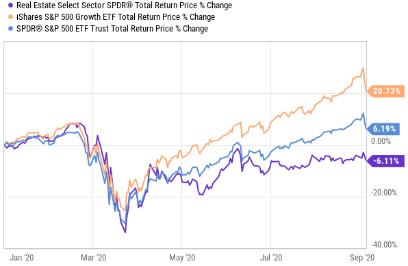From a high level, you’ll notice that real estate has significantly lagged other market sectors (such as technology and consumer discretionary) as covid has been a major impact.