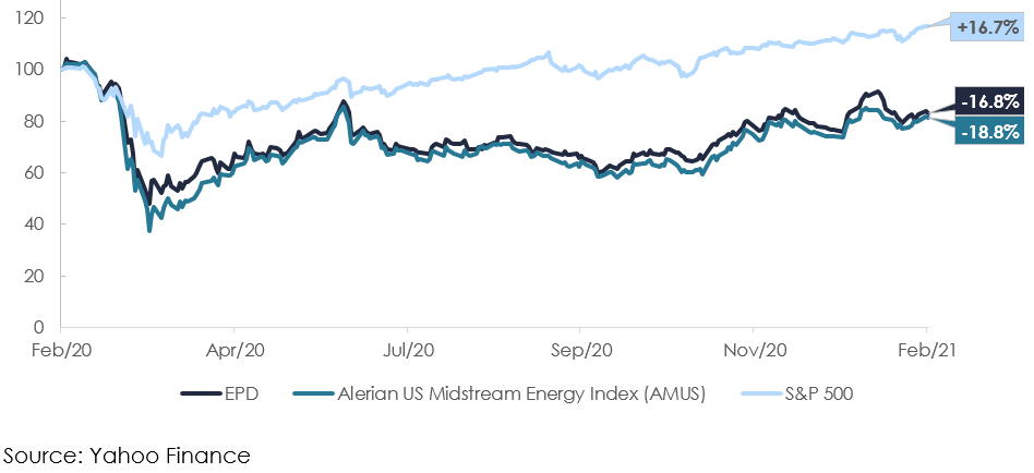EPD’s shares were beaten down significantly along with a lot of other midstream companies during the initial COVID-19 market turmoil. The share price has strongly recovered since the lows of March 2020, but has significantly lagged behind the S&P500 index. However, it has marginally outperformed the US midstream energy sector (as measured by Alerian US Midstream Energy Index) by about 2% in the past one year.