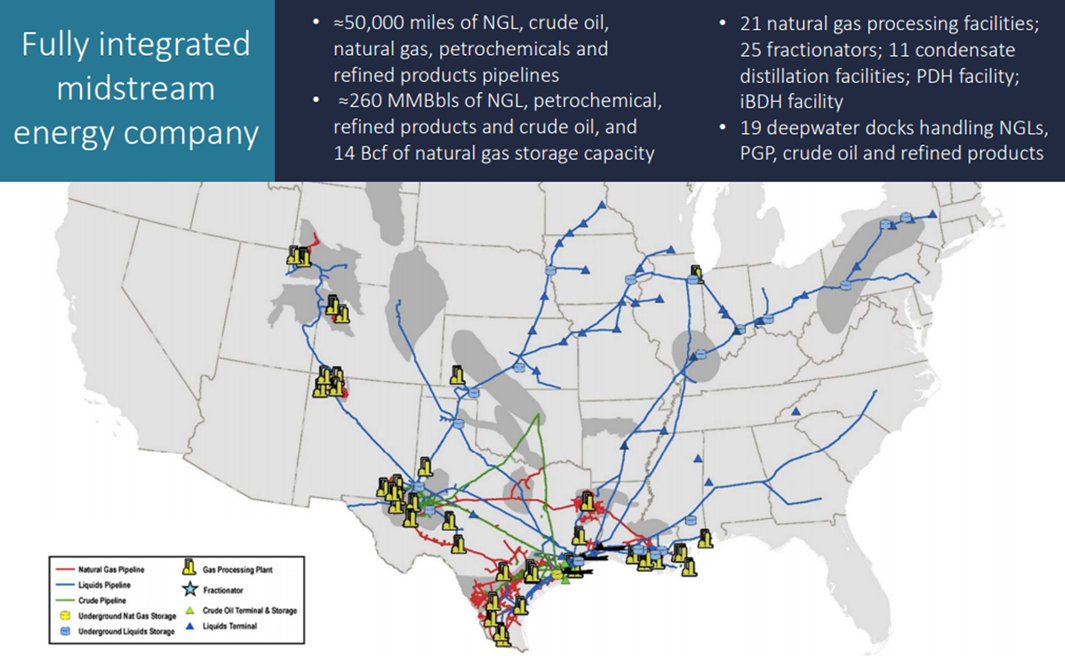 NGL Pipelines & Services (~40% of revenues): includes 22 natural gas processing facilities; 19,900 miles of NGL pipelines; NGL and related product storage facilities; 16 NGL fractionators; related NGL marketing activities; and LPG and ethane export terminals and related operations.