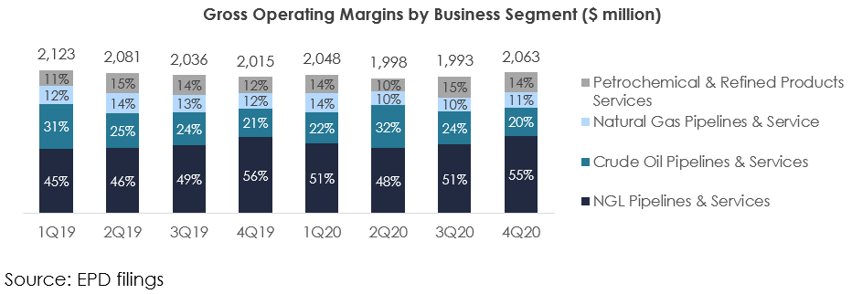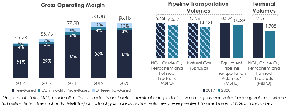 As is typical with most oil and gas midstream companies, EPD’s business is less susceptible to volatility in energy commodity prices compared to other energy companies, as a large majority of its income is fee-based. An added advantage is that EPD leverages its highly diversified asset portfolio to generate stable operating income from its broad range of business lines. As a result, the business has remained largely resilient to the unprecedented COVID-19 led market turmoil that was seen in most of 2020. This is substantiated by the more or less consistent gross operating income it generated in 2020 vis-a-vis 2019, despite the significant volume declines in its pipeline transportation, as well as in marine terminals.