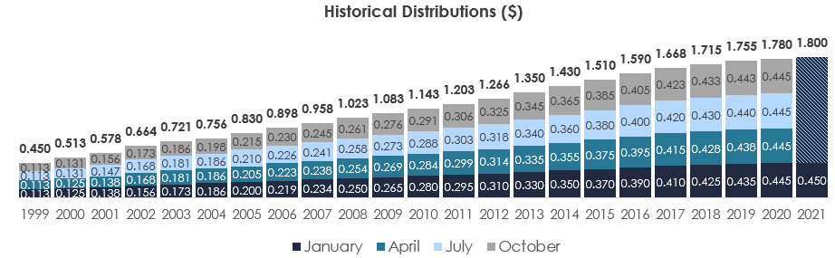 Unlike some midstream companies that cut their distributions due to the COVID-19 induced financial turmoil, EPD had maintained its quarterly distributions throughout 2020. In January 2021, the company announced an increase to its distribution, marking the 22nd consecutive year of distribution growth.