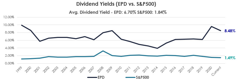 EPD’s distributions have historically yielded higher than the broader S&P500 index. In fact, the most recent distribution of $0.45 per share, which results in an annualized yield of 8.3%, is well above the S&P500's ~1.5% dividend yields, and also above the midstream sector’s ~7.6% yield.