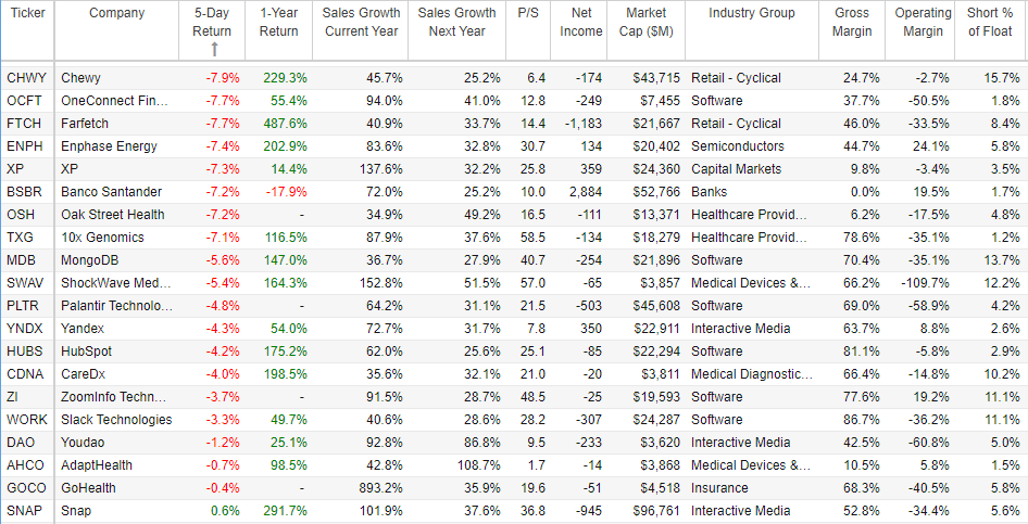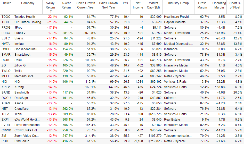However, not all stocks are created equally, and it would be a great disservice to value everything on P/E ratio alone. For example, top growth stocks often have very little earnings (by design) because they are spending heavily on growth (which is often the right thing to do to take advantage of market opportunities and to maximize long-term value). Rather, price-to-sales ratio can be a more prudent valuation metric in these growth stock cases. To put this in perspective, here is a look at the recent performance and price to sales ratios of top growth stocks with the highest revenue growth trajectories. You’ll notice the amazing 1-year performance numbers, but also the terrible 5-day results.