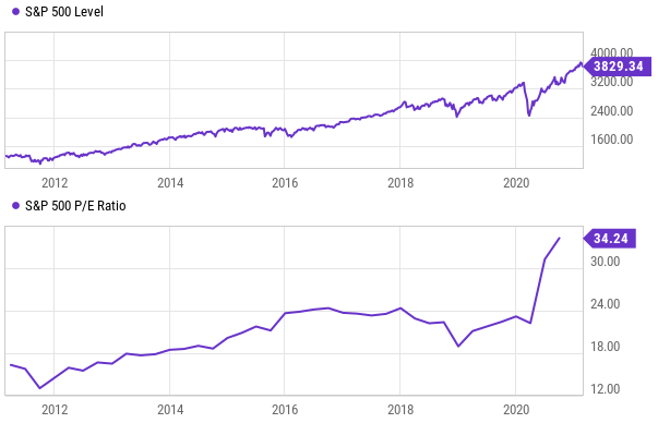 First, here is a look at the performance of the S&P 500 as well as the Russell 1000 large cap Growth index and the tech-heavy Nasdaq 100. Clearly overall performance has been very strong since the depths of the initial pandemic selloff in early 2020. And the strong performance has been even more pronounced for “growth-ier” stocks.
