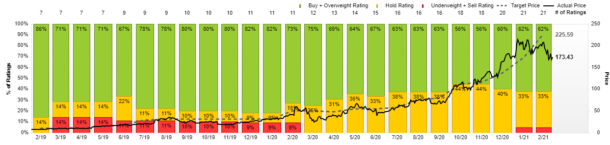 Enphase has estimated the serviceable addressable market (SAM) for its products going from $3.3 billion in 2019 to $12.5 billion in 2022. And it likely has significantly more growth beyond that. Analyst have been raising their price targets on this one rapidly (see the dotted line in the graphic below), but they still haven’t raised them nearly high enough relatively to the long-term growth potential.