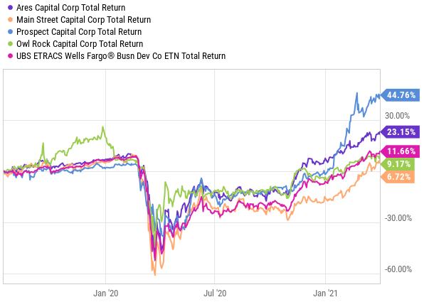 Consequently, ARCC’s portfolio consists of some of the strongest companies that have conservatively managed their credit metrics and have held up well to the various operational challenges posed the pandemic and generated strong EBITDA line profits. For perspective, here is a look at ARCC’s recent price performance versus other popular BDCs leading up to (and through) the pandemic (ARCC has been resilient).