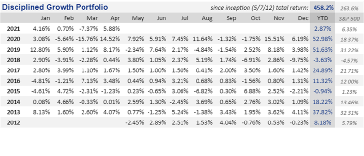 The Disciplined Growth portfolio continues to post strong long-term performance and was up 5.88% in April.