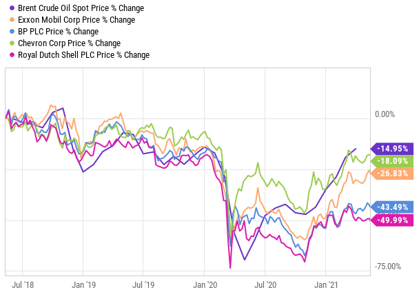 And as oil prices rise, so too do the prices of the big integrated energy companies. Specifically, there is a significant correlation between the stock prices of these companies and the price of oil, as you can see below.