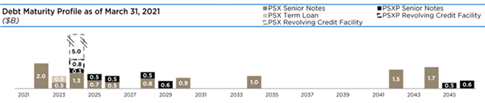 PSX manages its balance sheet quite conservatively, taking on high leverage only during times of financial stress, such as in 2020. Also, it’s debt maturities are spread out over significantly long time periods of time. For example, its current outstanding debt is scheduled for repayment over the next 25 years, and it doesn’t have any debt maturing in 2021. The company does have significant debt maturities coming up after 2021, but we think it will be in a good position to either pay or roll them off as it recovers from the shocks of the pandemic.