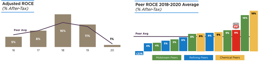 PSX has historically generated superior return on capital employed (ROCE) to its peer group. While its ROCE significantly declined to just about 1% in 2020, on a three-year basis, it still averaged a healthy 9%, which is superior to many of its peers, not just in the refinery business, but also in the midstream and chemical businesses.