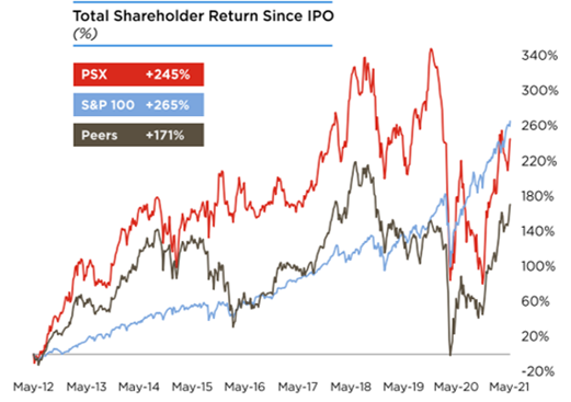 PSX has a solid track record of returning capital back to shareholders in the form of dividends and share buybacks. The company has returned as much as $28 billion to its shareholders since its listing in 2012, with repurchases of 34% of its shares initially outstanding and nine dividend increases. The dividend increases have been at a CAGR of ~20% since 2012, which we find very impressive. 2020 was an extremely challenging year, yet PSX maintained its dividends and also repurchased $443 million of its shares before suspending the buyback program in March 2020 to preserve liquidity amid the challenging operating environment.