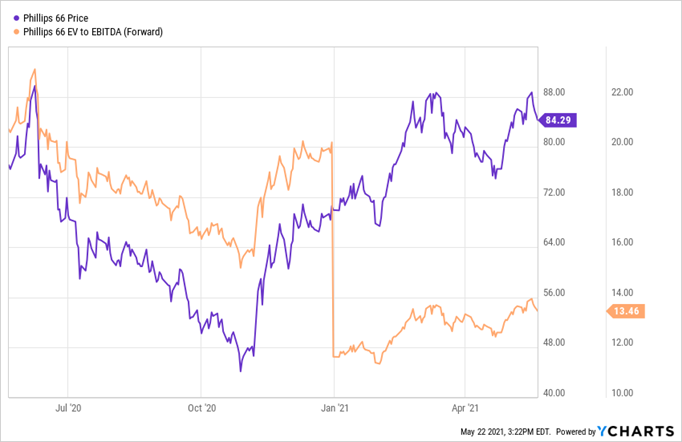The shares of PSX were heavily sold off in 2020, and the company did not do well for itself in the toughest year in its operating history since its IPO. However, with the improving economic conditions and the improving outlook for the energy industry in general, PSX’s shares started to gain strong momentum in the back half of 2020. Specifically, since October of 2020, the company’s shares have doubled in value and are up about 20% so far this year. However, the shares are still at a significant discount to pre-covid levels of over $100, and currently trade at a forward EV/EBITDA of 13.5x.