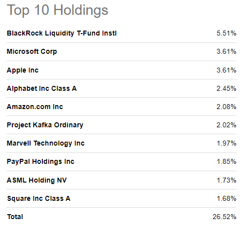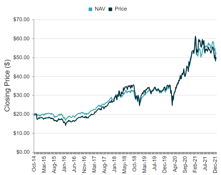 The next thing we like about this fund is its price—and we like the price for two reasons: (1) it trades at a discount to NAV, and (2) technology stocks have recently sold off a bit—thereby providing a more attractive entry point for buyers (especially consider the sector has attractive ongoing long-term growth potential).