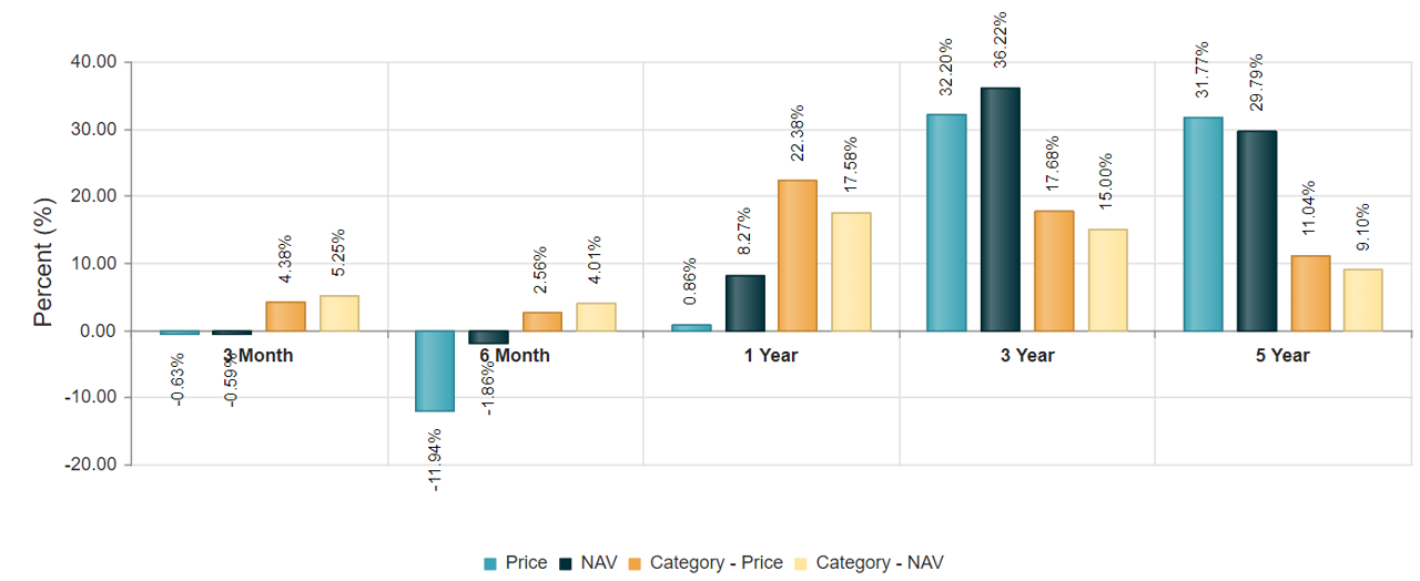 For a little more perspective, here is a look at BST’s historical price performance versus NAV performance (below). We really like to see good funds that have recent price performance that lags NAV performance because its means the discount has widened (or the premium has decreased), an all-else-equal this is a more attractive time to buy in our view (i.e. “buy low”). Specifically, you can see the price has underperformed the NAV over the last 3-months, 6-months and 1-year; this is attractive in our view because it increased the margin of safetfy for buyers, in our view.