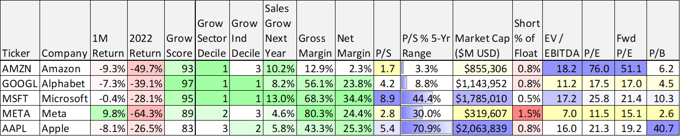 Before getting into the details on Amazon, here is our high-level ranking of 100 top growth stocks (see below). To be included in this table, we required at least a 10% expected growth rate for next year (many of them are much higher) and a market cap of at least $5 billion. We also limited the table to the three worst-performing market sectors of 2022: Technology, Communications and Consumer Discretionary.